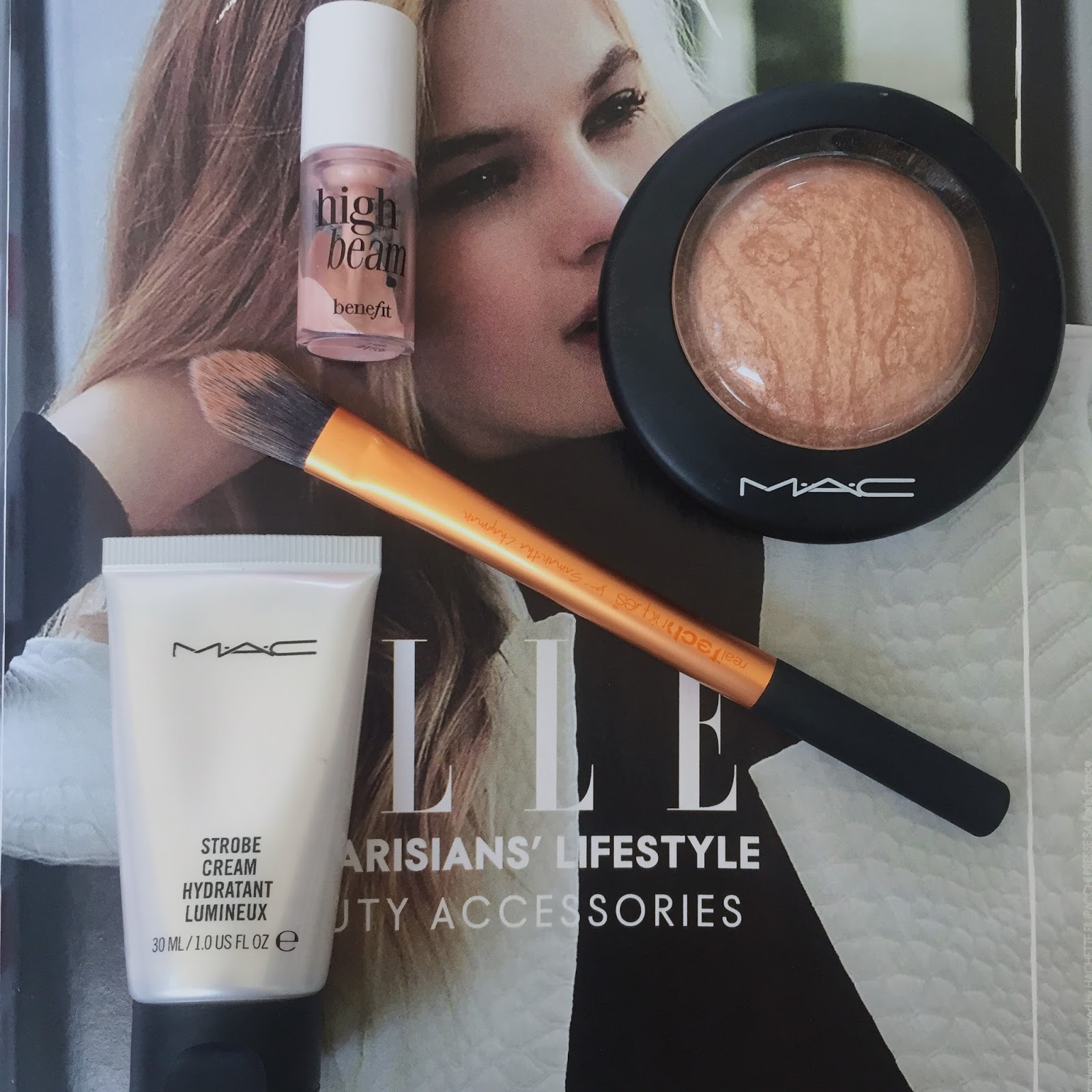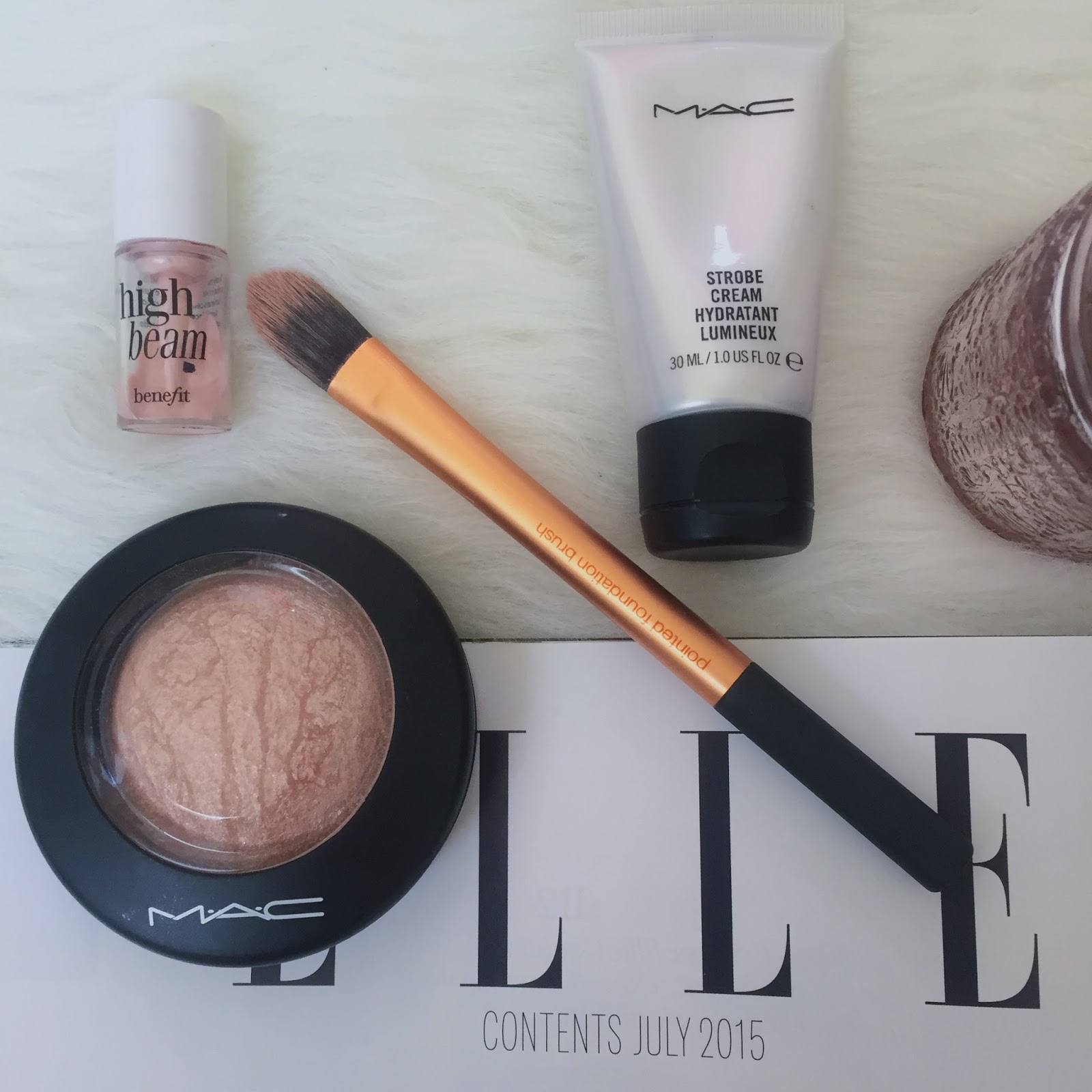 The first stage of highlighting your cheekbones is the liquid stage. Since you already have a glowy base radiating through the layers of your makeup, when you apply the liquid highlight its glow will be more enhanced with the help of the Strobe Cream that is already on your skin. My liquid highlight of choice is the coveted Benefit High Beam. I paint a short line of highlight on the tops of my cheekbones and I use my finger in quick, tapping motions to blend the product along my entire cheekbone and into my skin. A champagne alternative is Benefit’s Sun Beam (although this is on the darker, more brown side of champagne) and a white alternative is MAC’s Strobe Cream which, although already mentioned as a base, can double up as a liquid highlight.